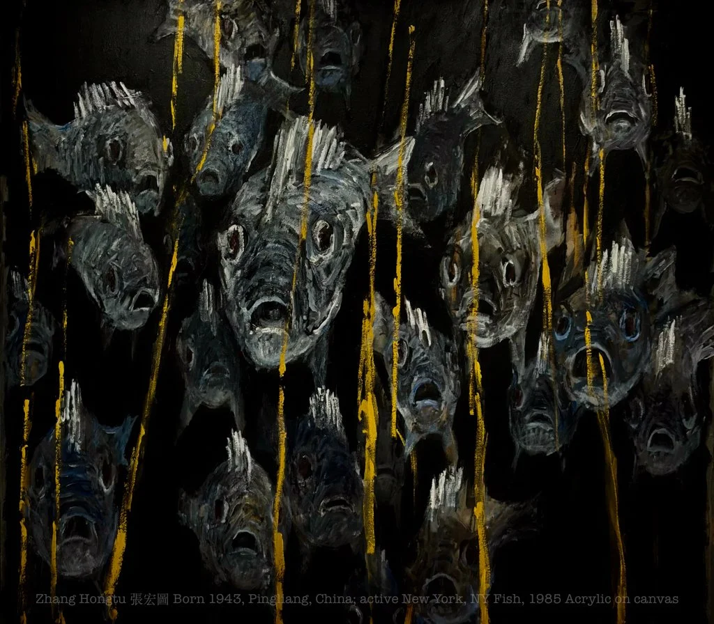 In 1982, I lived in lower Manhattan and often walked across Times Square to the Art Students League on 58th Street. I was shocked by the flood of people coming toward me on the narrow sidewalks and soon realized that I was one of the crowd, no different from others... Then, I started Fish. After days of repeated daubing on the canvas, Times Square disappeared, leaving a group of fish jumping into new waters. I tried to locate their expressions, but it was difficult; fright? strangeness? happiness? All right and all wrong. I’ll end with Zhuangzi, the fourth-century BCE Daoist philosopher: Zhuangzi pointed at a river, saying, “How happy are the fish in the river!” Huizi replied, “You are not a fish; how do you know that the fish are happy?” Zhuangzi said, “You are not me; how do you know that I don’t know that fish are happy?”